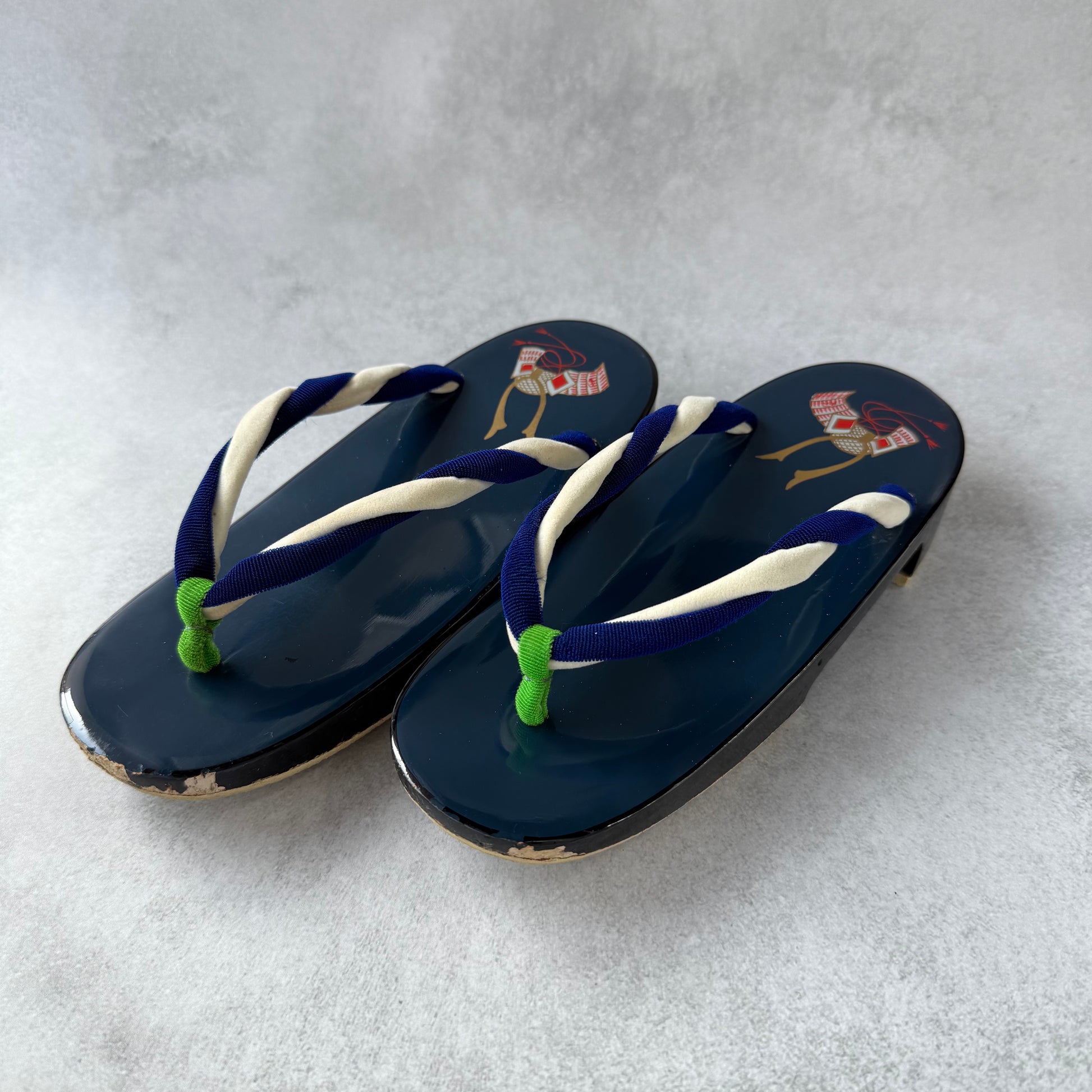 This particular pair was made in the 1980s, and features a glossy navy-blue base hand-painted with a golden kabuto (samurai helmet)—a classic motif symbolizing strength and protection.