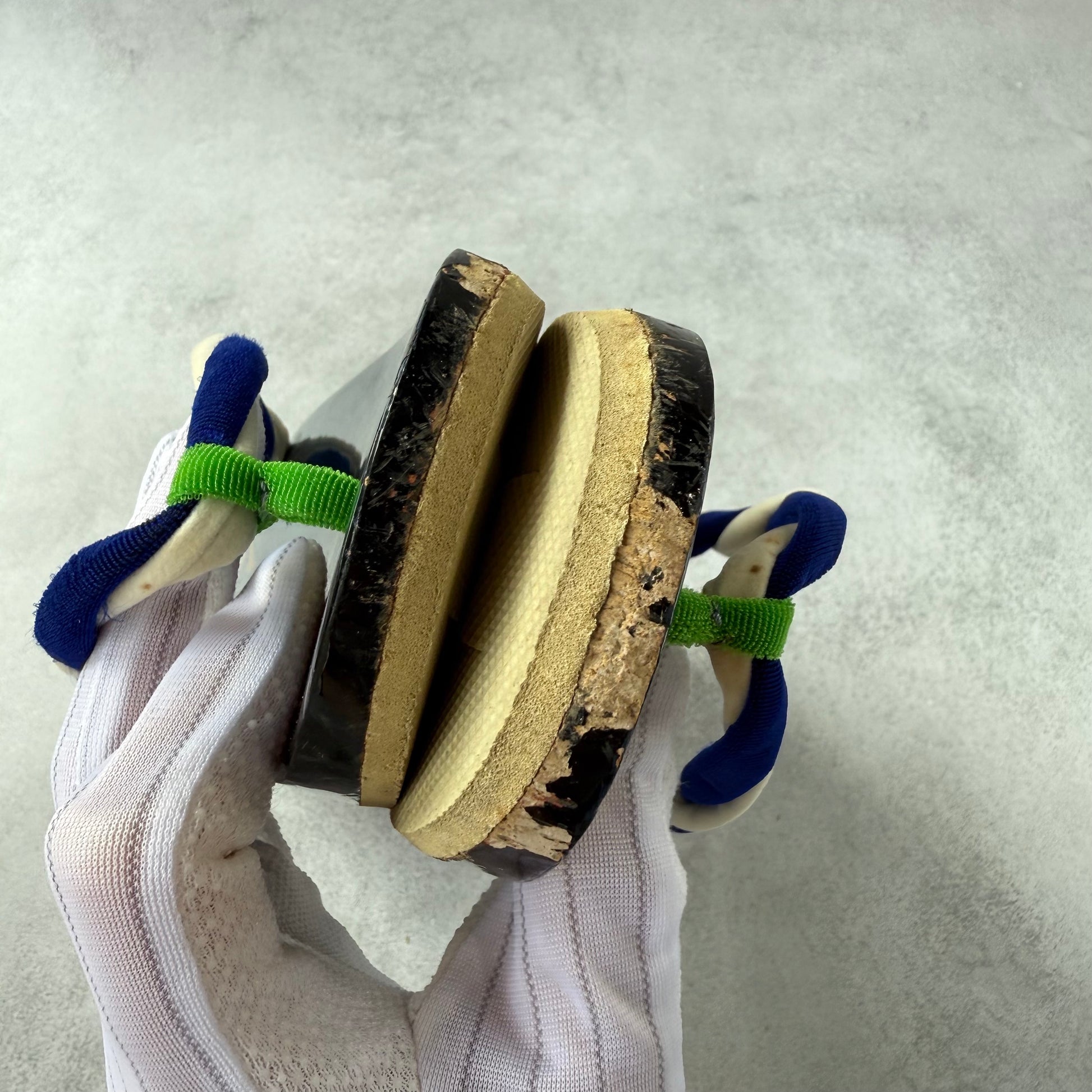 The white and navy twisted straps, with a green accent at the toe, offer both charm and tradition. Crafted in Japan using high-quality wood and traditional methods, the sandals follow the two-tooth design typical of formal geta.