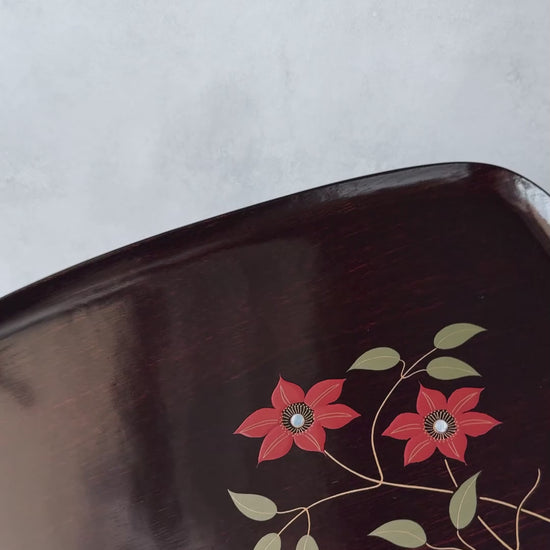 Made from natural keyaki wood (zelkova), the tray features a glossy black lacquer surface decorated with red clematis flowers (Tessen) in makie (gold & silver powder painting), with delicate raden (mother-of-pearl inlay) for added brilliance.