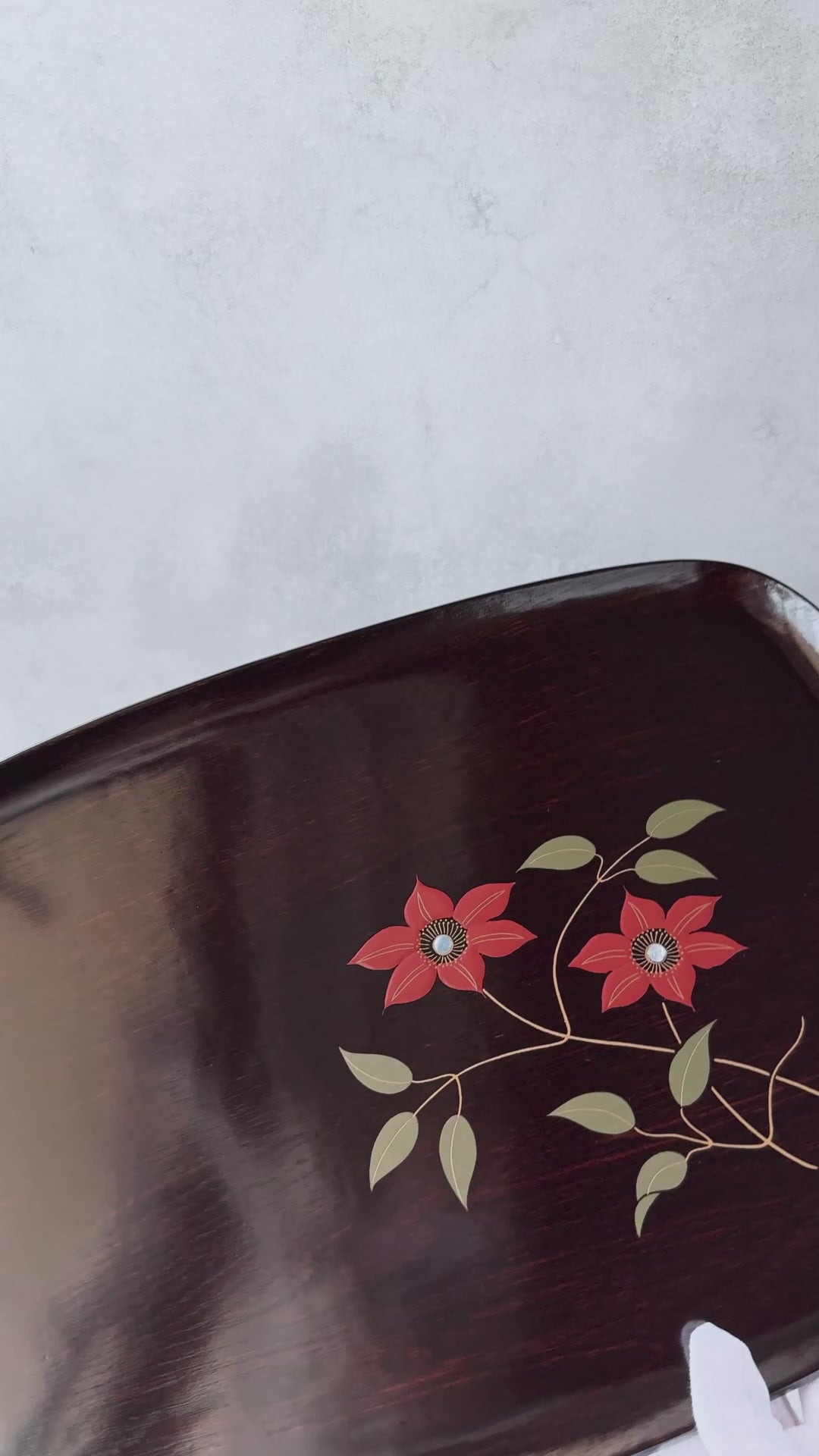The bold red flowers and shimmering raden details contrast beautifully with the deep black lacquer finish, making this tray a striking piece for any collection.